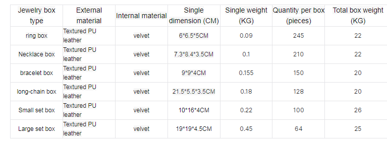 | Weight: (g) | Ring box: 52g Pendant box: 80g Banglebox:131g Long necklace box:170g Medium set: 235g Large set:426g |